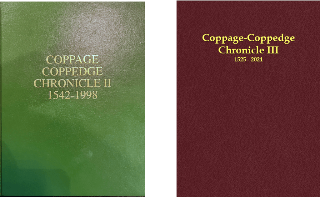 Since family history documentation is never done, work on the next chronicle began soon after the Chronicle publication. With the research help of many family members, Walter Edwin Overstreet published the “Coppage-Coppedge Chronicle II (1542-1998).” Copies of Chronicle II (see green book below) are still available for $25, including postage.