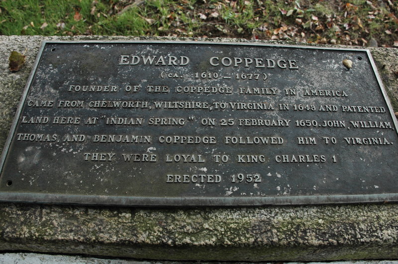 FOUNDER OF THE COPPEDGE FAMILY IN AMERICA CAME FROM CHELWORTH, WILTSHIRE, TO VIRGINIA IN 1648 AND PATENTED LAND HERE AT “INDIAN SPRING” ON 25 FEBRUARY 1650. JOHN, WILLIAM THOMAS, AND BENJAMIN COPPEDGE FOLLOWED HIM TO VIRGINIA.