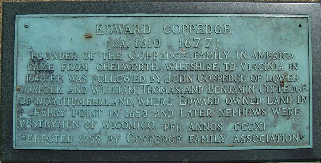 FOUNDER OF THE COPPEDGE FAMILY IN AMERICA CAME FROM CHELWORTH, WILTSHIRE, TO VIRGINIA IN 1648. HE WAS FOLLOWED BY JOHN COPPEDGE OF LOWER NORFOLK AND WILLIAM, THOMAS. AND BENJAMIN COPPEDGE OF NORTHUMBERLAND, WHERE EDWARD OWNED LAND IN CHERRY POINT IN 1653 AND LATER NEPHEWS WERE VESTRYMEN OF WICOMICO PER ANNOS CCCXI.