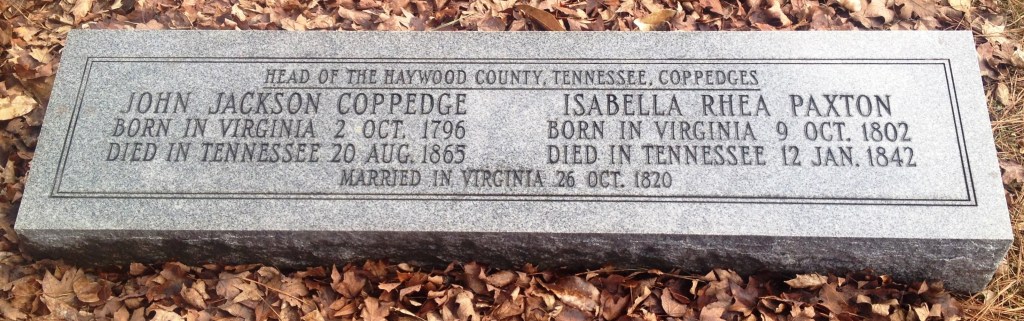 This marker is for John Jackson and Isabella Rhea (Paxton) Coppedge, located in the Dancyville Methodist Cemetery in Dancyville, Tennessee. It identifies John Jackson “Jackie” Coppedge as the “Head of the Haywood County, Tennessee, Coppedges.”